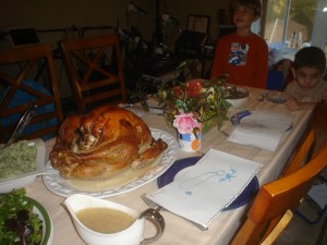 Shopping lists in hand, on the Wednesday before Thanksgiving shoppers were in groups of two or three hovered around the spice section, baking section, and meats department. I was able to fetch a fresh 19lb turkey–it was the smallest one in the fridge filled with 24 lbs turkeys. To brine or not brine was the question when I got home, and I decided not to brine. I found a turkey roasting method by the barefoot contessa, cross checked it with Claire Robinson’s 5 ingredients or less–lemon, onion, garlic, butter, rosemary–prepped the turkey at 10 am, it was in the oven at 10:20, and out of the oven at 2:30–rested 20 minutes, and turned out good! Accompanied by side dishes prepared by Ipek & myself–stuffing, gravy, sweet potatoes, peas & corn, mashed potatoes, squash, pasta (firinda style with spinach and cheese), salad with pears we had a feast! Troy drew wonderful name plates for everyone at the table. Each guest had a unique identifier–Atil’s was fishing, Dede’s was a hippo, Babaane’s was an ay dede, Mike’s a bear in a cave, mine an ax (what did he mean??), Dost’s was a caterpillar, and Ipek’s was Ipek pouring tea! He made us all laugh with his creations.