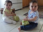Today I was cleaning out the fridge and the two babies were crawling at fast speed towards the open door. I gave them two cabbages from the fridge but then they were so cute playing I stopped cleaning the fridge!